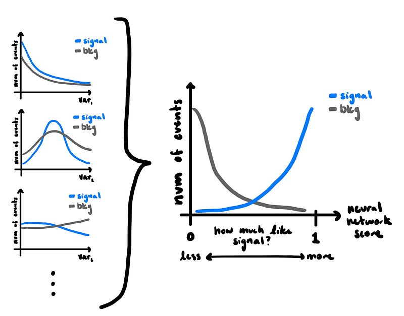 Sometimes the distributions are very different, and sometimes they are very similar. If there are a few characteristics that are very distinguishing we can simply grab all events in a particular region, as we are confident most of them will be the signal we want. In this analysis, there are no characteristics that are so clear. So instead we use a tool called a Neural Network. This tool takes in as many characteristics as we want, and instead of making simple cuts on characteristics it will instead learn from all of the characteristics at once! It will then output a score on a range from background-like (0) to signal-like (1). Then we can instead grab the region of this score where we are confident there is a lot of signal.